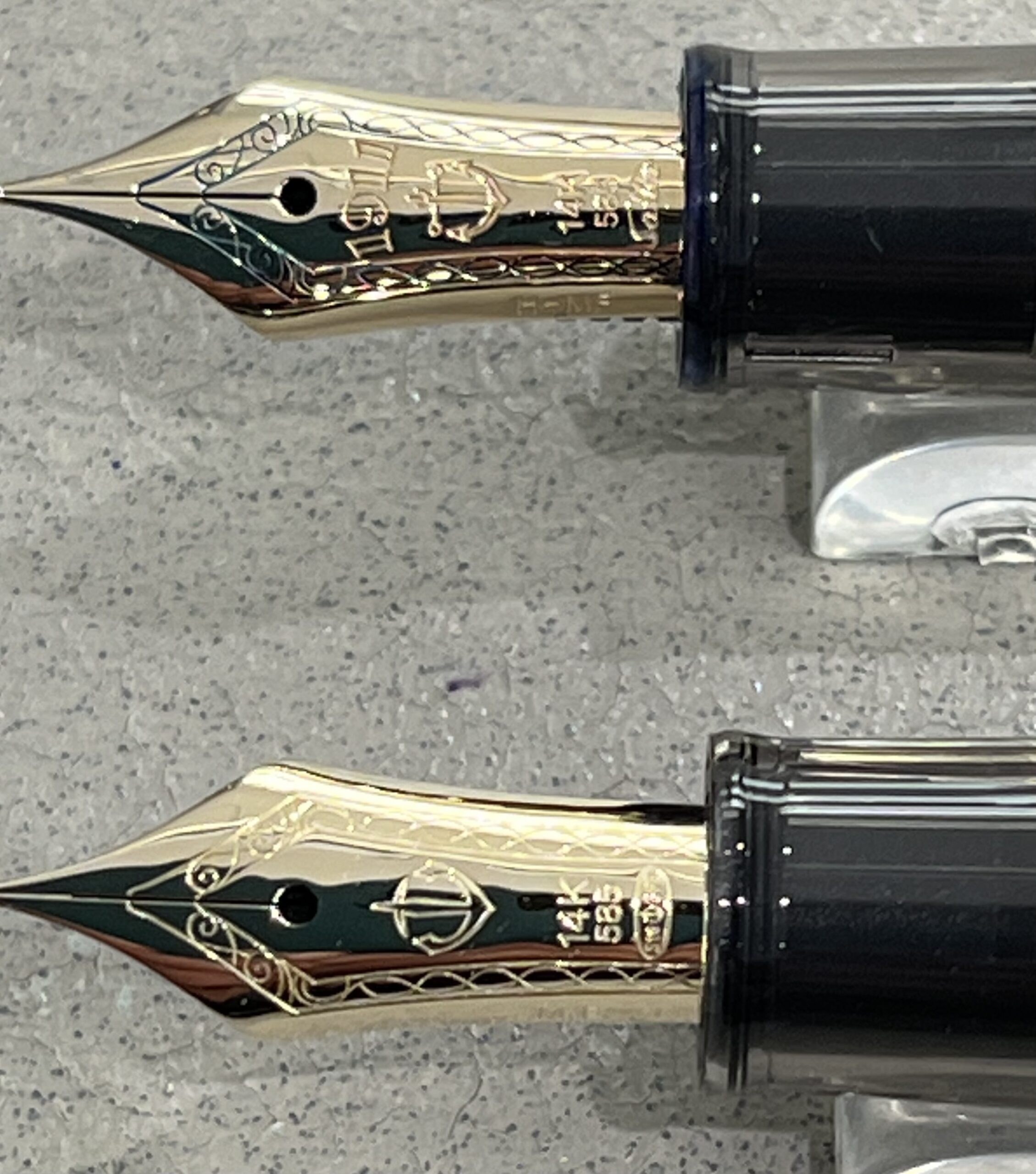 上:写真撮影に使用した旧仕様ロゴのプロトタイプサンプルのペン先刻印 下:販売商品の現行のセーラー万年筆14金中型ペン先仕様の刻印